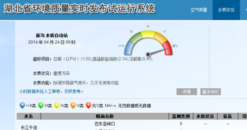湖北省環(huán)境質(zhì)量實(shí)時發(fā)布試運(yùn)行系統(tǒng)顯示,距離余氏墩水廠上游20公里處的新溝,漢江水質(zhì)狀況為劣5類(最差級別),總磷1.5,高錳酸鹽指數(shù)2.34,溶解氧0.45。不愿透露姓名專家指出,這些指數(shù)表明該江段存在嚴(yán)重的有機(jī)物污染,但因無更多資料,無法判斷到底是工業(yè)污染還是農(nóng)業(yè)面源污染。