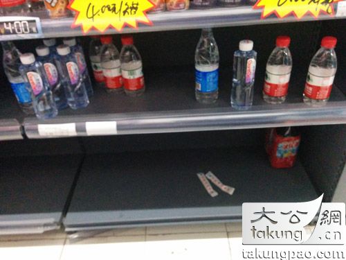 超市貨架上大容量瓶裝水已售罄(記者李曉波攝)