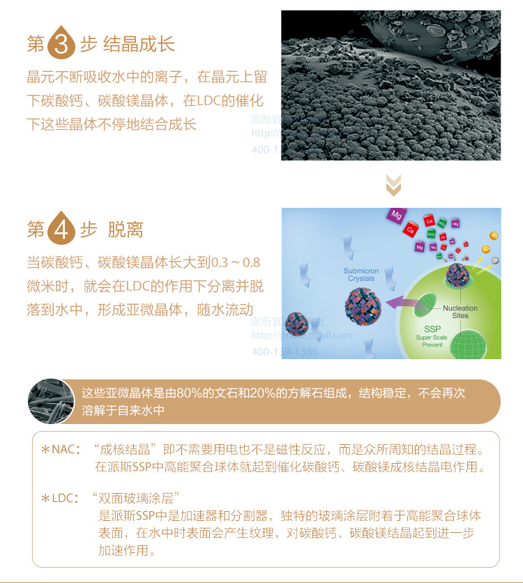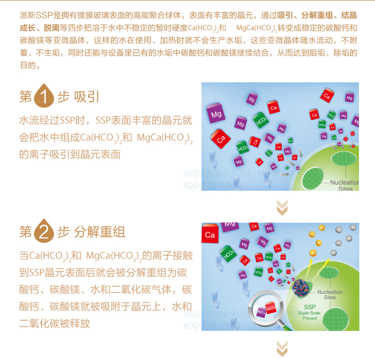 派斯無鹽軟水機,采用的就是納米晶無鹽軟水技術(shù)是新型的物理軟水方式,借助派斯SSP高能聚合球體,通過吸引、分解重組、結(jié)晶成長、脫離等四步把溶于水中不穩(wěn)定的暫止硬度的碳酸氫鈣、碳酸氫鎂轉(zhuǎn)變成穩(wěn)定的碳酸鈣和碳酸鎂的亞微晶體,這樣的水在使用、加熱時就不會生成水垢;這些亞微晶體隨水流動,不附著、不生垢,同時還能與設(shè)備里已有的水垢中的碳酸鈣和碳酸鎂繼續(xù)結(jié)合,從而達到阻垢、除垢的目的。